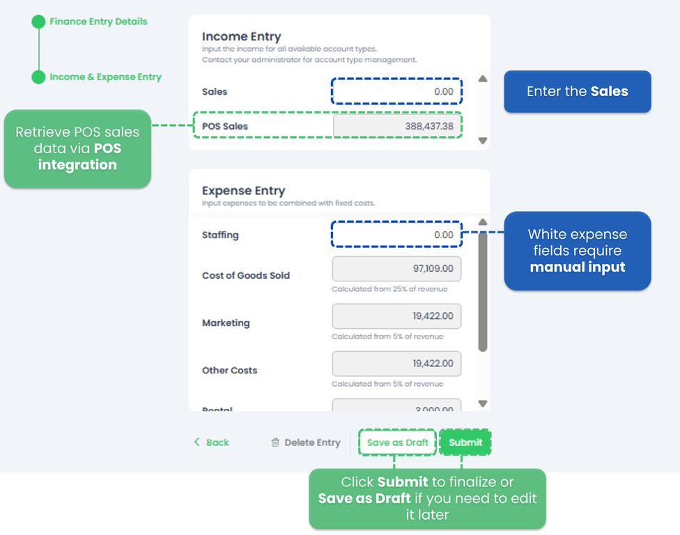 - Click Submit to finalize the Finance Entry, or Save as Draft if you need to edit it later.