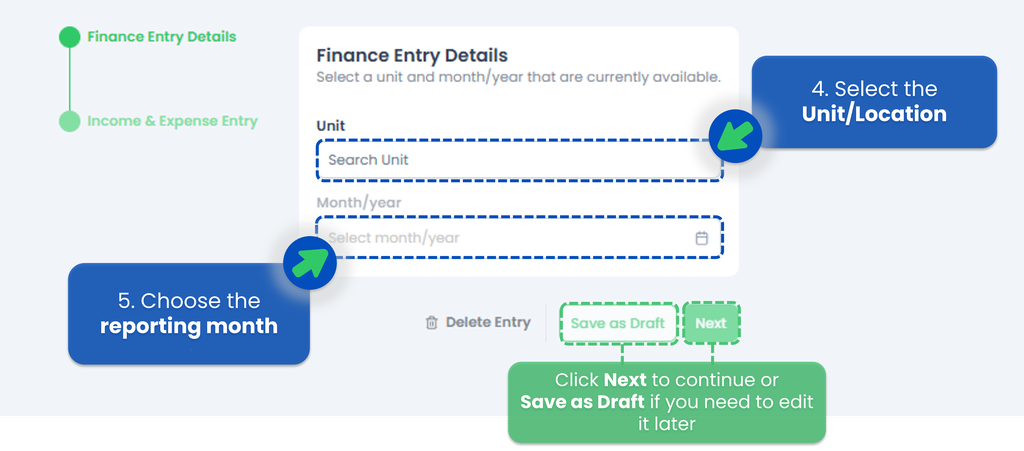 - When a Finance Entry is saved as Draft, the system records it for the selected unit/location and month.