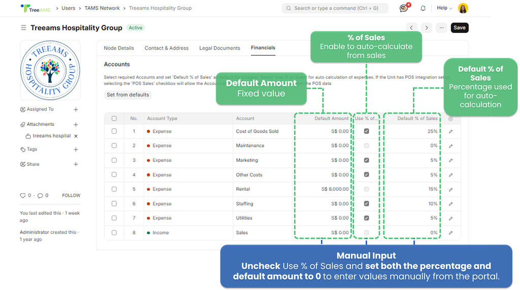 - Use % of Sales β Automatically calculate the amount based on sales.