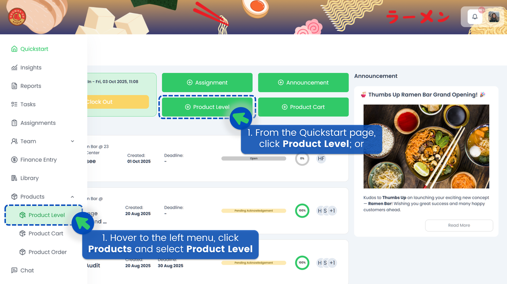 - From the Quickstart page, click Product Level or hover to the left menu, click Products and select Product Level.