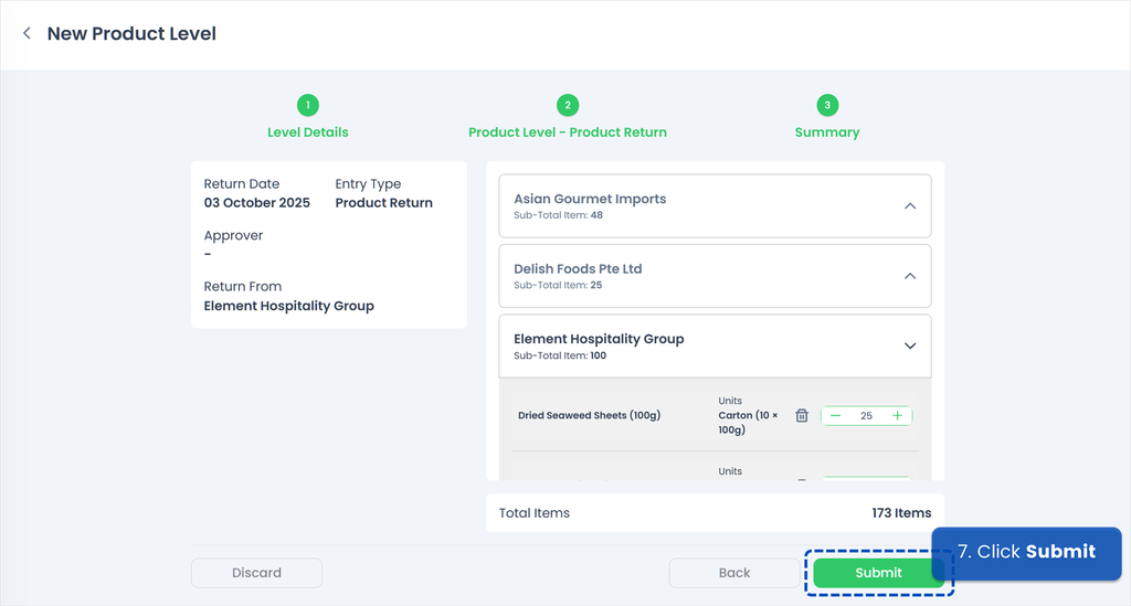 - On this summary page, TreeAMS automatically organizes all products that need to be returned by their suppliers. Now, please review your Product Return entry and click Submit to proceed