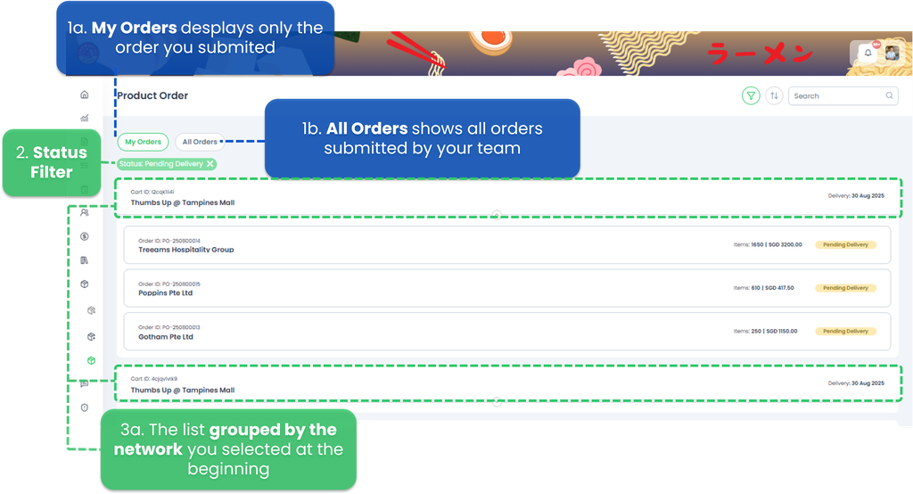 - is first grouped by the network you selected at the beginning as the delivery address (e.g., Thumbs Up @ Tampines Mall) β itβs like your top-level filter.