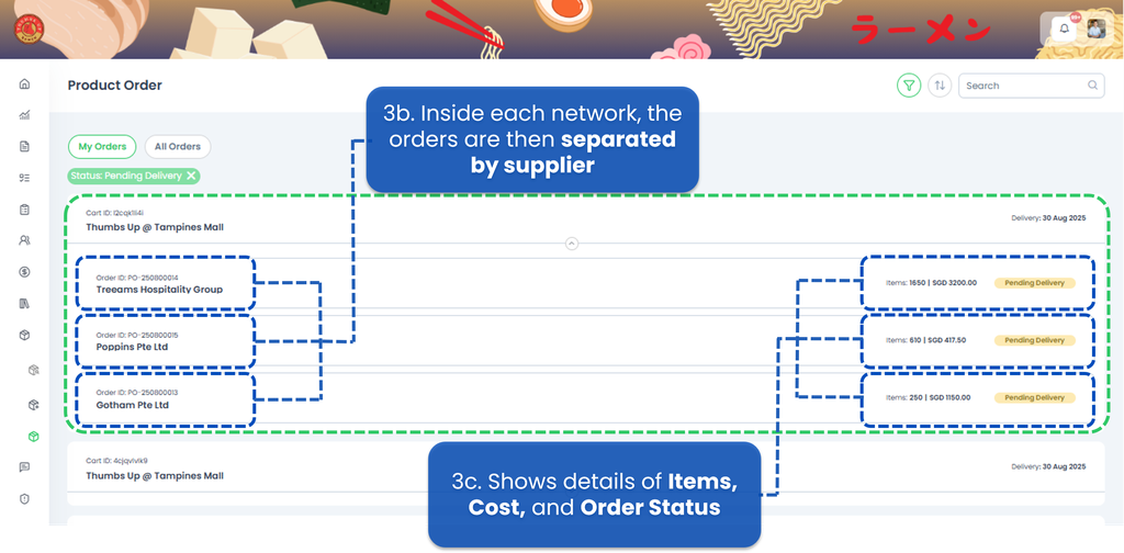 - Inside each network, the orders are then separated by the supplier, so you can quickly see which orders go to which vendor.