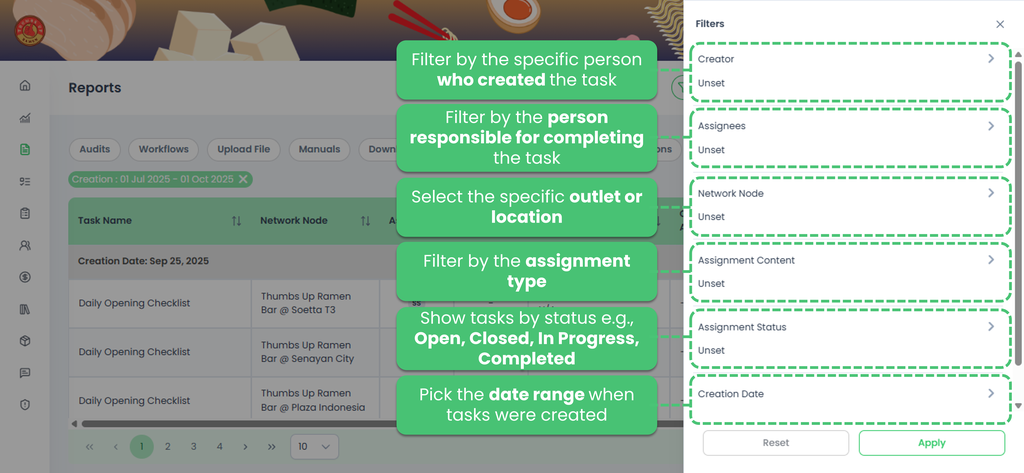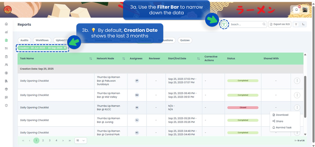 Use the Filter Bar (Creator, Assignee, Network Node, Status, Creation Date) to narrow down the data.π‘ By default, Creation Date shows the last 3 months.- Creator β Choose the specific person who created the task.