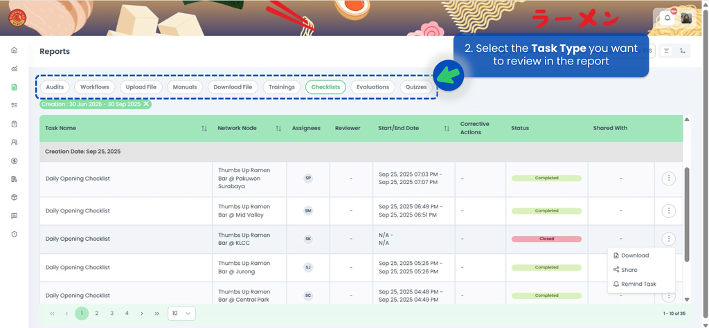 - Action Button (three-dot button on the right) β click to access options: Download the report, Share it with others, or Send Reminder to the assignee.