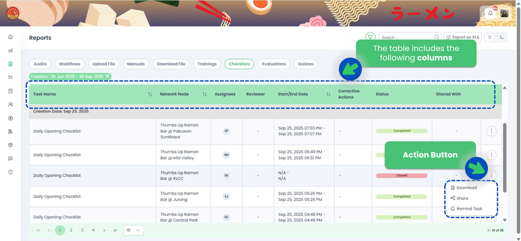 From the detail view, you can check who did the task, when it was done, and take actions such as Generate Report or Send Reminder. - When you click Export as XLS,