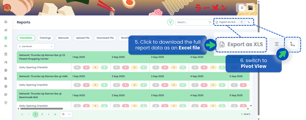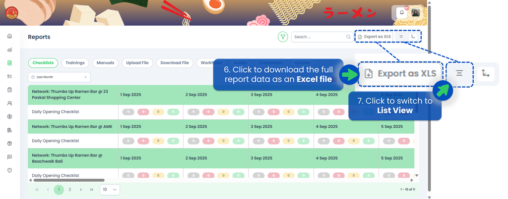 Use it to: compare sites and dates at a glance, spot missed tasks (e.g checklists), and track operational consistency.
