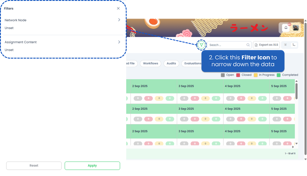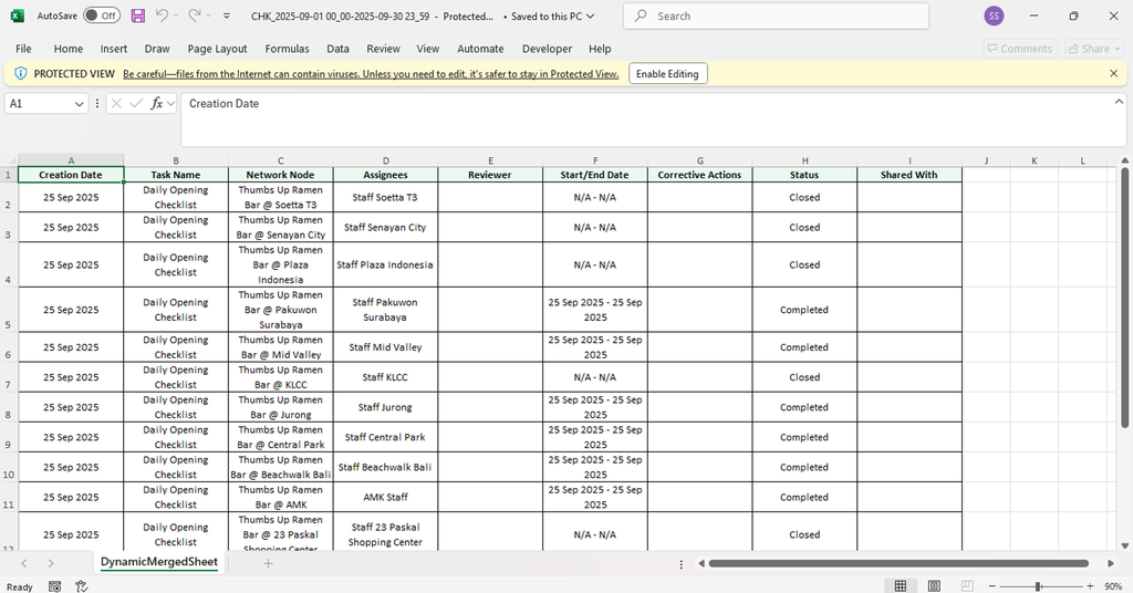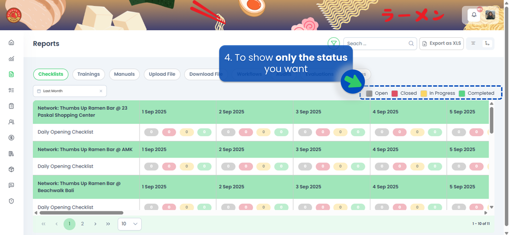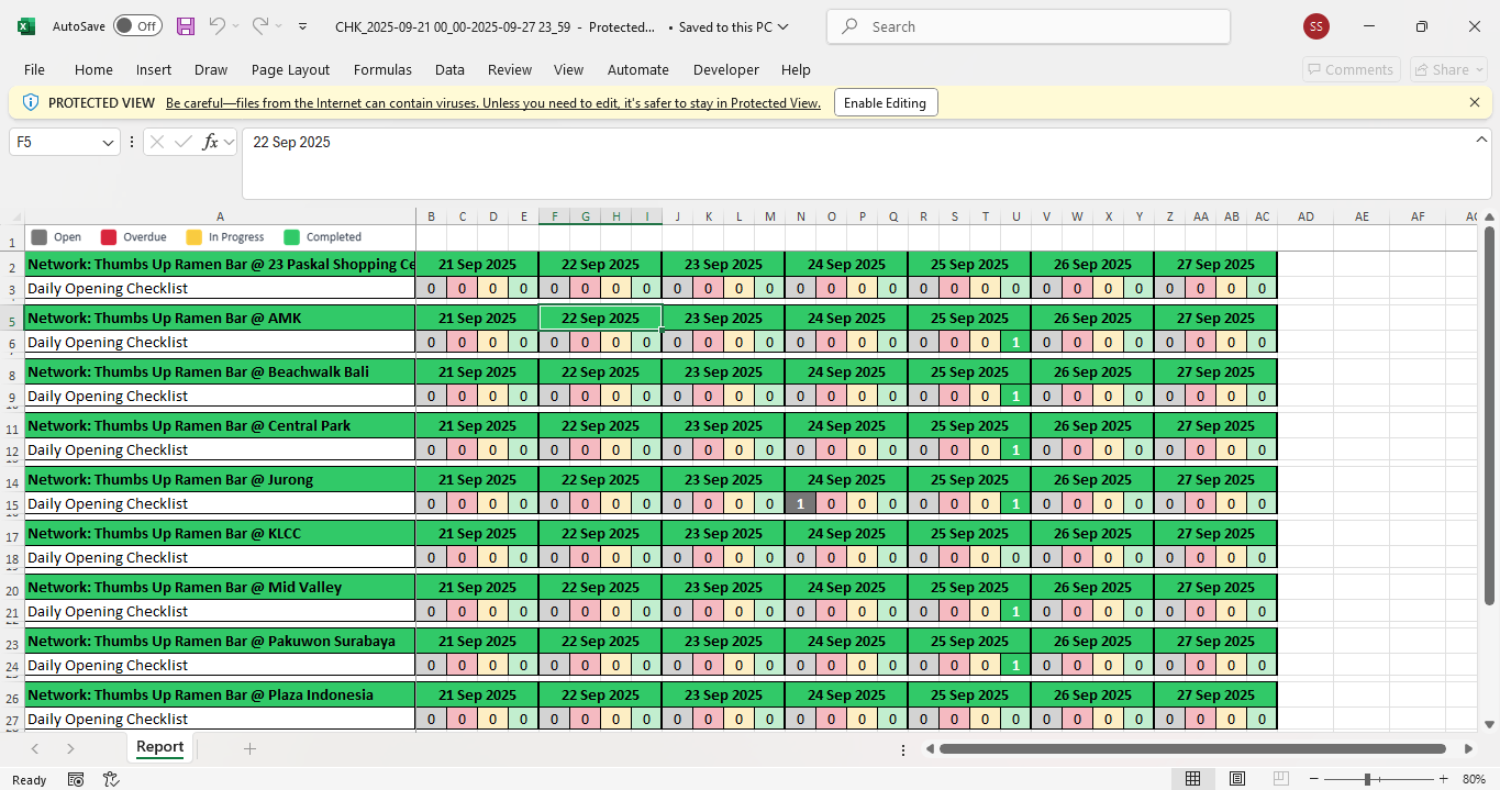 - Example: If the green box shows β1β under 25 Sep 2025 β means that outlet has 1 task Completed on that day.